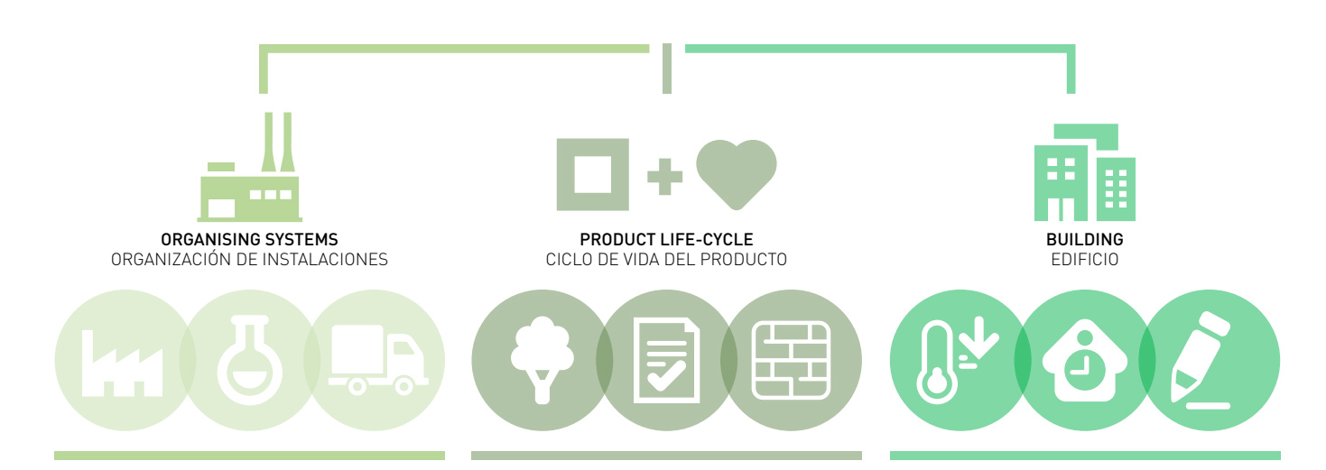 We deploy actions both at the ORGANIZATION level (facilities) and at the PRODUCT level (life cycle) considering the function at the BUILDING level.